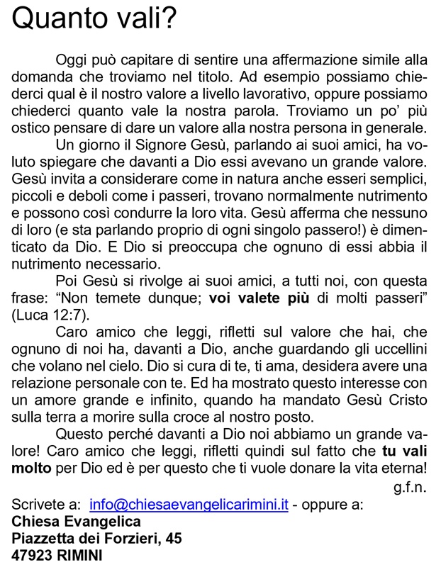 La Chiesa Cristiana Evangelica che si riunisce a Rimini in via dei Forzieri 45, è composta da credenti che hanno accettato Gesù Cristo come loro personale Signore e Salvatore "per grazia mediante la fede" (Efesini 2:8). I credenti si incontrano con lo scopo di adorare e lodare il Signore Gesù, ascoltare l'insegnamento della Bibbia, coltivare la comunione fraterna, pregare ed intercedere per tutti gli uomini che non conoscono personalmente l'amore di Dio. Questo sito è stato aperto con l'intento di stimolare chi lo legge ad approfondire il lieto messaggio di Gesù Cristo; "affinchè crediate che Gesù è il Cristo, il Figlio di Dio, e, affinchè, credendo, abbiate vita nel suo nome" (Giovanni 20:31). Una parola per te - Mese di Febbraio 2026 |